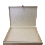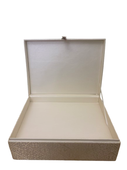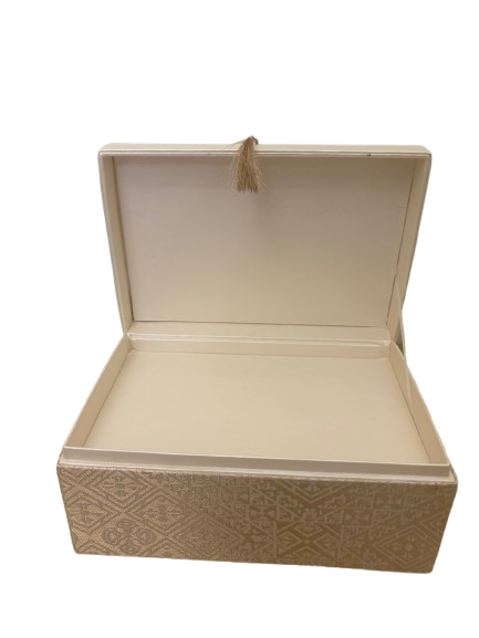 Chaque boîte est revêtue d’un tissu texturé aux motifs damassés dans des teintes or pâle et beige crème. L’ensemble dégage une aura de raffinement oriental et classique.